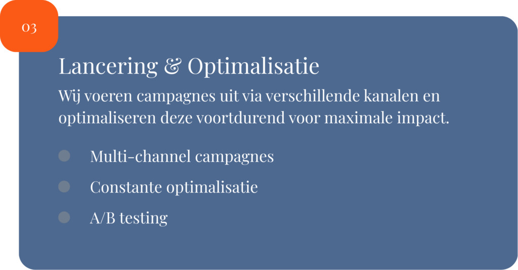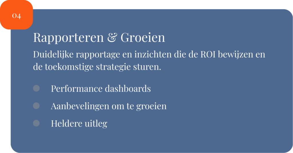 Datagestuurde campagnes via betaalde sociale media, zoekmachines en display-advertenties die uw ROAS (Return On Ad Spend) maximaliseren.